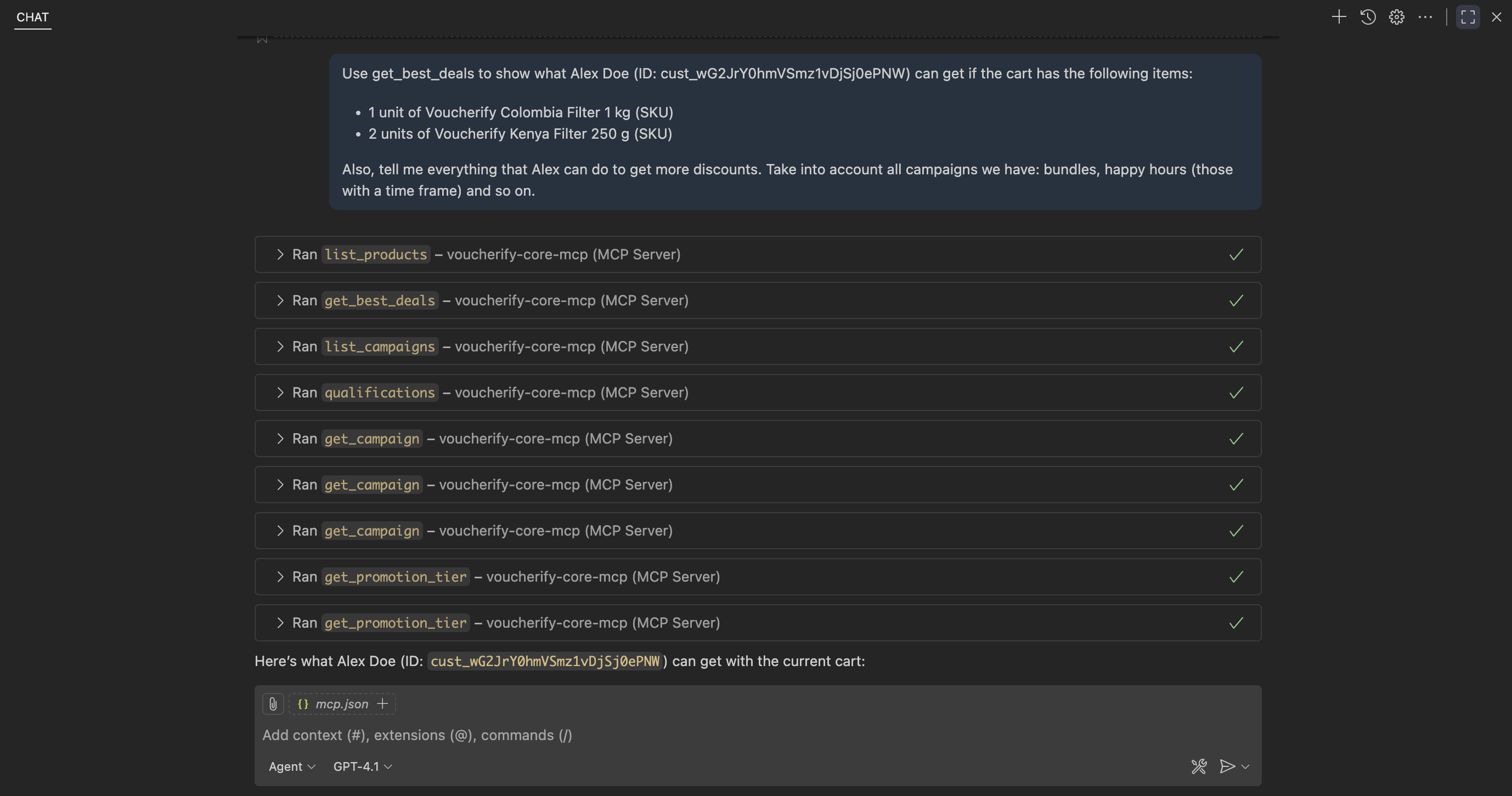 In this scenario, the user wants to learn what best deals a customer, Alex Doe, can get if they have a specific cart. The scenario used is get_best_deals. The Voucherify Core MCP ran 9 API calls to find out what best deals Alex Doe can get at the moment and what they’ll get if they meet specific conditions. In this case, one prompt was enough to propose best deals for Alex Doe, like:
