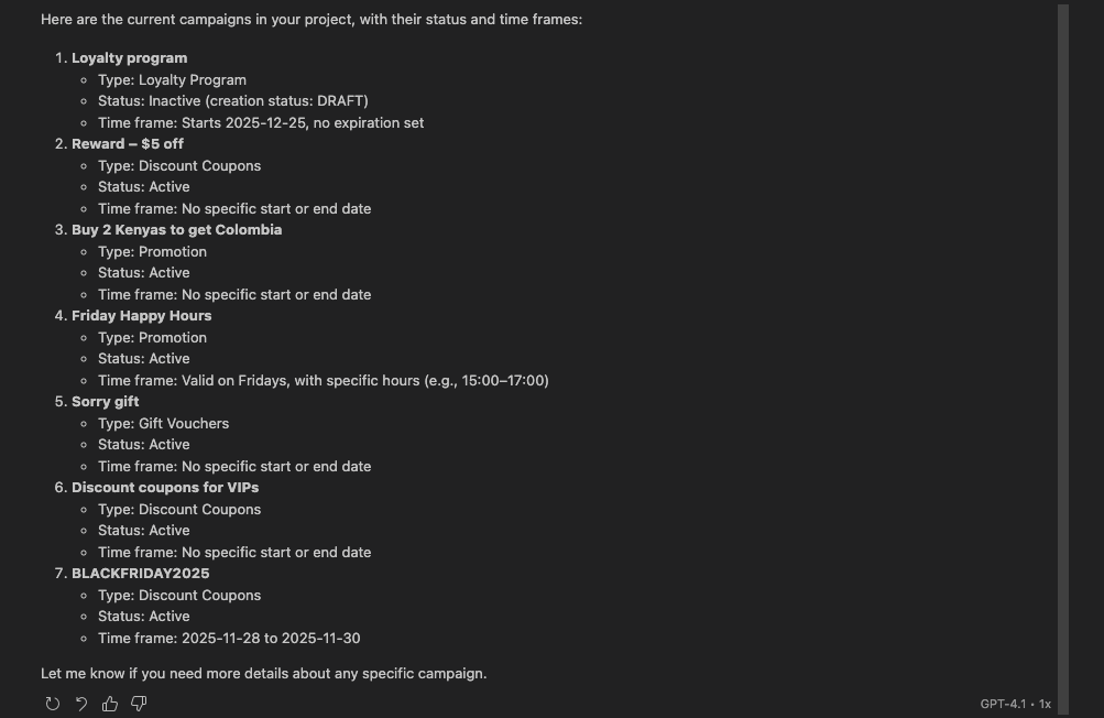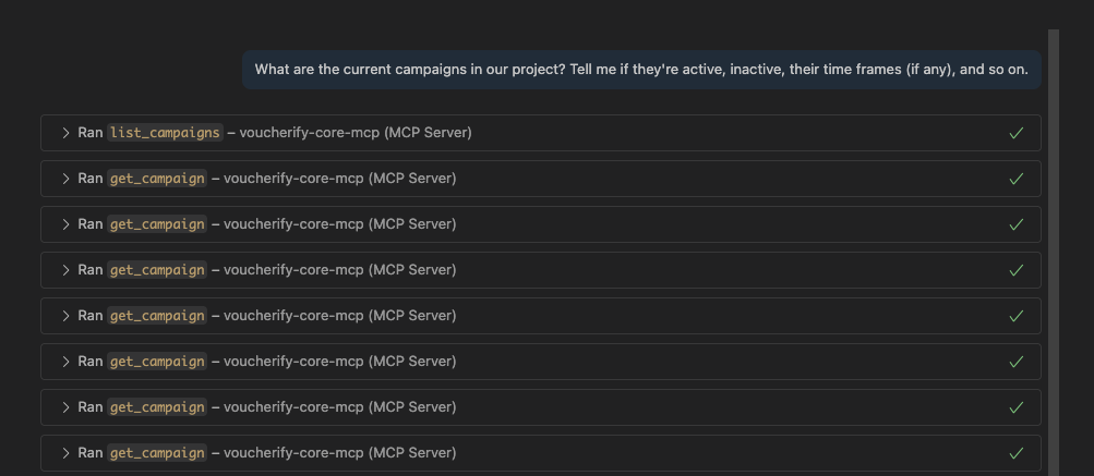 In this scenario, the user wants to learn what Voucherify campaigns there are in the project and if they’re active, have time frames set, and similar details. . This gives a quick overview of needed info about campaigns. The Voucherify Core MCP runs 8 API calls to fetch the requested data. The MCP returned campaign details and summarized the campaigns by their type, status, and provided time frames. For example, the response shows: